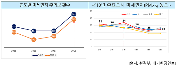 - 미세먼지 연평균 농도는 점차 감소하는 추세이나 미세먼지 주의보 횟수를 살펴보면 오히려 증가하는 것을 알 수 있습니다.